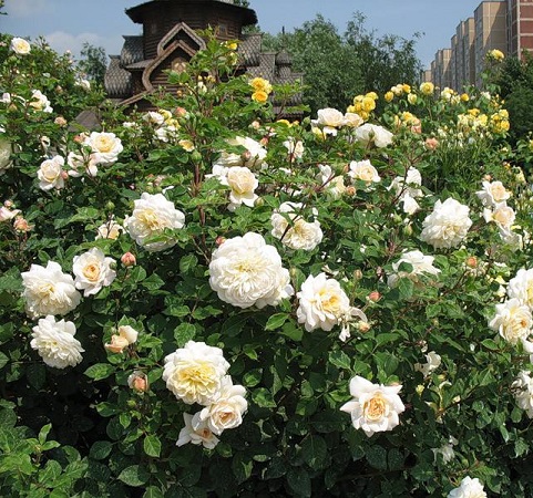 Очень устойчивая и обильноцветущая роза, с крупными, розетковидными цветками, в начале цветения слегка чашевидными, позже лепестки отгибаются вниз. Цвет нежно-абрикосовый, бледнеющий до кремового к краям. Цветет очень обильно, крупными кистями на концах слегка изогнутых побегов. Приятно пахнет чайной розой.