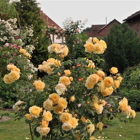 Этот великолепный сорт - одна из самых популярных английских роз, и также одна из самых изменчивых. Бутоны варьируют по цвету от персиковых до красных, раскрываются они в чашевидные махровые 7-10 см цветки, обычно ярко-желтые, в некоторых условиях с персиковыми тонами, с возрастом выгорают до более светлых. Одновременно на кусте можно видеть цветки нескольких оттенков. Цветки появляются в кистях, аромат средний или насыщенный. Обильно цветет ранним летом, затем следуют волны умеренного цветения остаток сезона. Побеги длинные, дуговидные, листва темно-зеленая, блестящая. Куст сильнорослый, прямостоячий. В холодном климате вырастает до 150 см, в жарких странах выпускает очень длинные побеги 250-300 см, и его можно пустить по опоре. В умеренном климате роза может демонстрировать обе характеристики: дайте побегам вытянуться и пустите их по опоре, либо обрезайте наполовину после первого цветения, чтобы стимулировать ветвление. Некоторые утверждают, что выращивание на собственных корнях также стимулирует ветвление. Устойчивость к болезням хорошая.