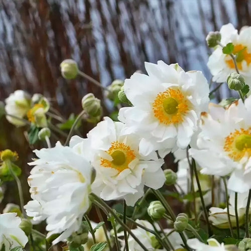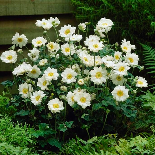 В высоту достигает от 80 до 100 см. Листья прикорневые очень красивые, достаточно крупных размеров, с зубчатыми краями, тройчатые. Цветки в соцветии насчитываются до 15 штук, белого цвета, имеются золотистые тычинки. Цвести начинает анемона японская Whirlwind в августе или сентябре. Предпочитает солнечное место с плодородной, легкой и рыхлой почвой. Название латинское: Anemone japonica 'Whirlwind' Особенности выращивания и ухода: хорошо растет на освещенных местах и в легкой полутени, не переносит сильной жары, подойдет хорошо дренированная почва, рыхлая и плодородная, лучше всего суглинок. Использование: цветки анемон прекрасно смотрятся в букетах, для этого используют обычно белоцветные сорта и виды. Анемону применяют в миксбордерах, групповых посадках, в подлеске около дорожек. Используется в медицине.