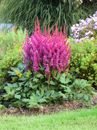 мощный, эффектный сорт с длинными пурпурно-сиреневыми соцветиями и глянцевой темной листвой. Это одна из самых выносливых астильб, которая прекрасно чувствует себя даже на солнечных участках, не теряя насыщенности окраски. Цветение продолжительное и обильное, начинается в августе и продолжается до сентября, когда большинство многолетников уже завершили сезон.