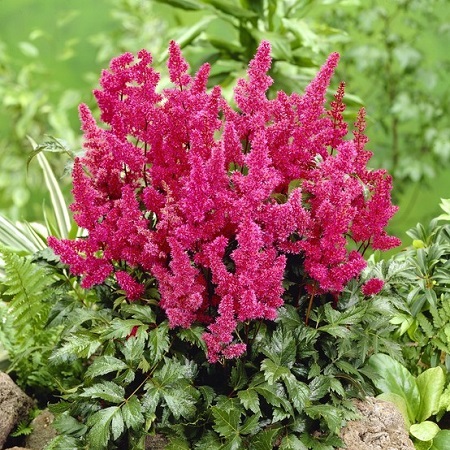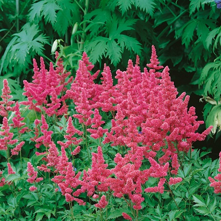 Высота растения 50-60 см. Цветки плотные пушистые карминово-розовые с приятным ароматом, собраны в плотные, ромбические соцветия. Цветение с первой декады июля. Листья дважды перистые, темно-зеленые, глянцевые, на красноватых черешках, что делает куст нарядным до и после цветения.