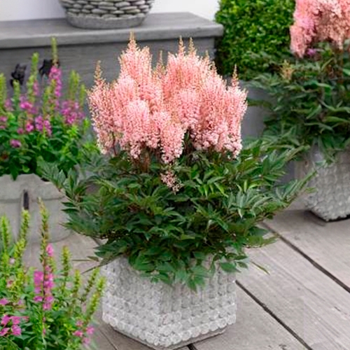 Карликовый сорт высотой 40-45 см. Листва красивая, темно-зеленая, блестящая. Соцветие короткое, плотное глубокого розового цвета на темных стеблях. Цветение в июле-августе.