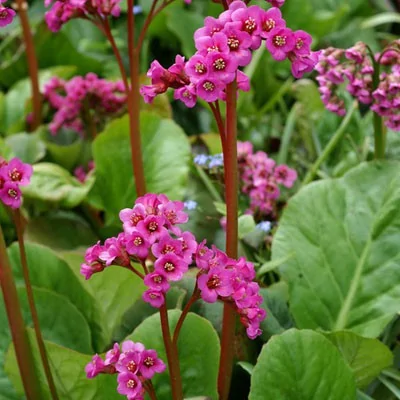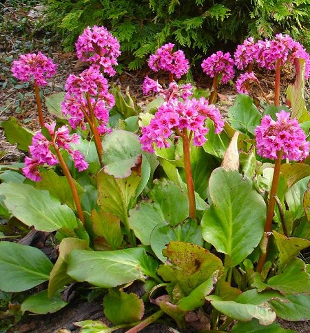Весной, едва сойдет снег, над перезимовавшими розетками появляются соцветия. Цветоносы растут и цветут одновременно. Летом красивые плотные зеленые листья, они служат прекрасным фоном для цветущих растений. После своего цветения до середины июля баданы «отдыхают». Затем начинается период роста корневища и закладки почек новых розеток, которые зацветут лишь через два-три года.