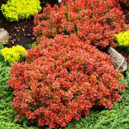 На фото барбариса 'Admiration' видно, как плотный куст высотой около 40–50 см и шириной до 80 см образует яркое цветовое пятно. Весной и летом листья горят оранжево-красным цветом с золотистой окантовкой, а осенью переливаются насыщенным алым оттенком. В мае куст покрывается мелкими желтовато-красными цветками, а к осени украшен блестящими красными ягодами, сохраняющимися после листопада.