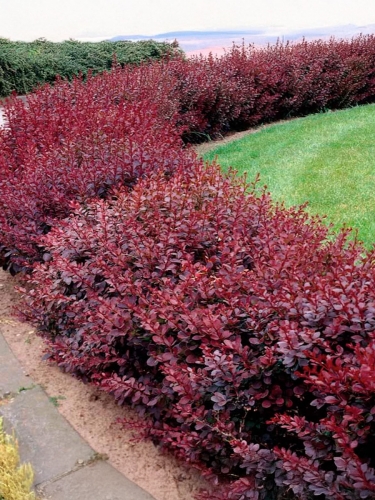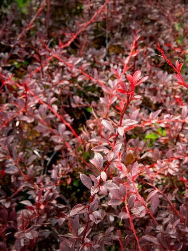 На фото барбариса 'Red Chief' видно, как густой куст высотой 120–150 см образует элегантную, немного поникающую форму. Листья узкие, ланцетные, тёмно-пурпурные летом и ярко-красные осенью. В мае куст покрывается мелкими жёлто-красными цветками, а к осени усыпан кораллово-красными блестящими ягодами, которые долго сохраняются на побегах, добавляя декоративности даже в конце сезона.