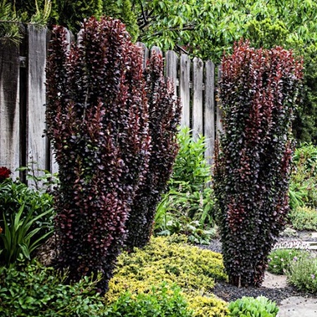 Саженец барбариса Тунберга 'Helmond Pillar' (Berberis thunbergii 'Helmond Pillar') — эффектный декоративный кустарник с узкой колонновидной формой и насыщенной пурпурно-красной листвой. Его строгий вертикальный силуэт и глубокий цвет делают сорт идеальным акцентом для современных садовых композиций.