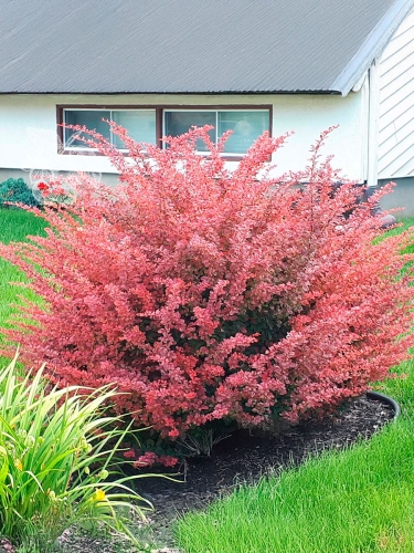 Барбарис Роуз Глоу — один из самых эффектных сортов с мраморной окраской листвы. Идеален для создания цветовых акцентов и контрастных композиций, где требуется выразительный декоративный акцент.