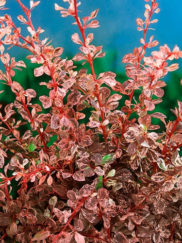 Саженец барбариса Тунберга 'Rose Glow' (Berberis thunbergii 'Rose Glow') — декоративный кустарник с утончённой мраморной окраской листвы. Его пурпурно-розовые листья украшены серебристыми и розовыми пятнами, благодаря чему куст выглядит нарядно с весны до осени.
