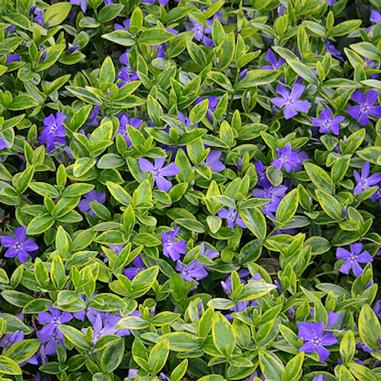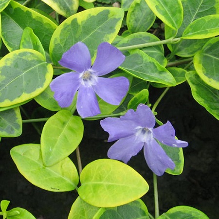 Многолетнее стелющееся вечнозеленое растение с кожистыми блестящими листьями. Листья зеленые с яркой золотистой каймой. Высота кустика до 15 см. Цветки небесно-голубые. Цветет в мае-июне.