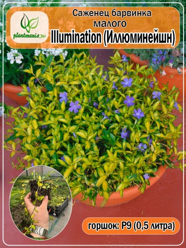 Барвинок малый 'Illumination' (Vinca minor 'Illumination') – яркий пестролистный почвопокровный многолетник, который эффектно выделяется золотисто-зелёной листвой и нежными сиренево-фиолетовыми цветками. Быстро разрастается, образуя декоративные ковровые куртины высотой 10–15 см и шириной до 50–70 см. Побеги тонкие, стелющиеся, легко укореняются в узлах и достигают длины 40–60 см. Листья овальные, кожистые, глянцевые, длиной 2–3 см, окрашены в ярко-золотистый цвет с зелёной каймой по краю и сохраняют декоративность даже зимой. Цветки появляются в апреле–мае, диаметр около 2–2,5 см, их сиренево-фиолетовый оттенок эффектно контрастирует с золотистой листвой. Цветение обильное, возможна повторная волна в августе. Благодаря этому 'Illumination' полностью оправдывает своё название – его листва «освещает» самые тенистые уголки сада.