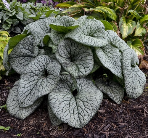 Компактное, очень привлекательное растение высотой 25-30 см. Листья серебристые с четкими зелеными прожилками. Цветет в мае-июне ,голубыми цветками. Растение не агрессивное, до осени сохраняет форму, не разваливается.