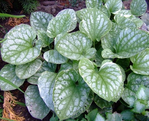 Компактное, очень привлекательное растение высотой 25-30 см. Листья крупные, зеленые, с регулярными серебристыми пятнами. Цветет в мае-июне ,голубыми цветками. Растение не агрессивное, до осени сохраняет форму.