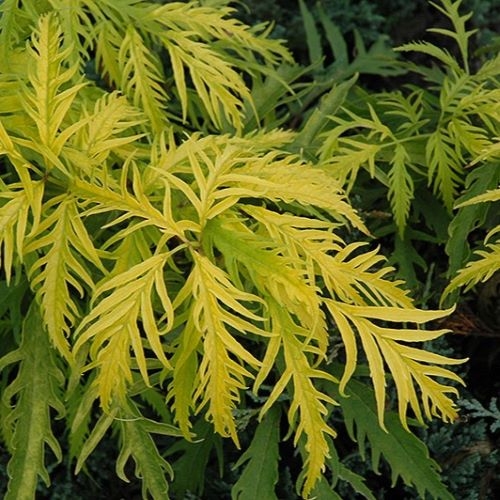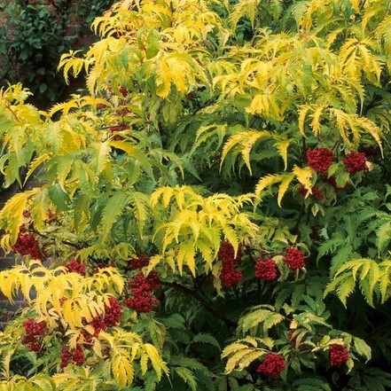 Декоративный сорт бузины, который отличается своим ярким золотистым листопадом. Он является кустарником среднего размера, достигающим высоты около 2-3 метров. Кора ствола и веток темно-коричневая. Крупные листья, рассечённые по глубине поверхности, кажутся кружевными, начинают своё развитие зелеными, но по мере взросления становятся золотисто-желтыми. Они обладают приятным ароматом.