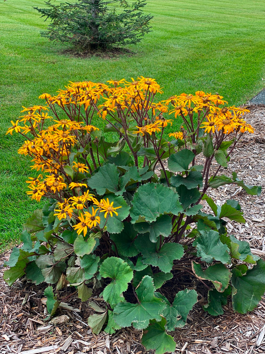 Бузульник — эффектный многолетник, который станет настоящим украшением вашего сада. Он ценится за крупные декоративные листья и яркие жёлтые или оранжевые соцветия, которые появляются во второй половине лета и сохраняют декоративность до осени. Даже без цветов бузульник выглядит впечатляюще благодаря своей мощной листве, образующей пышные куртины.