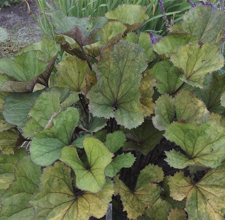 Листья: Листья крупные сердцевидной формы.Лист волнистый зубчатый тёмно-зелёный с коричнево-бордово-фиолетовым оттенком