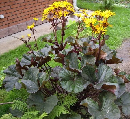 Эффектный многолетник высотой 60-80 см. Стебли и обратная сторона листьев интенсивно пурпурные. Листья крупные, до 20 см в диаметре, на длинных черешках. Колосовидное соцветие состоит из ярко-желтых крупных "ромашек". Время цветения: июль-август.