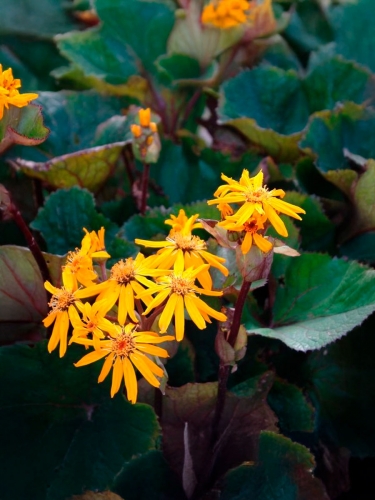Впечатляющий сорт с крупной пурпурно-металлической листвой и яркими оранжево-жёлтыми соцветиями, которые словно вспыхивают на фоне темного фона. Весной молодые листья имеют насыщенный свекольно-пурпурный оттенок, летом приобретают глубокий тёмно-бронзовый блеск, а осенью становятся шоколадно-коричневыми. Контраст между тёмной листвой и солнечными цветками делает этот сорт одним из самых эффектных в роду Ligularia.
