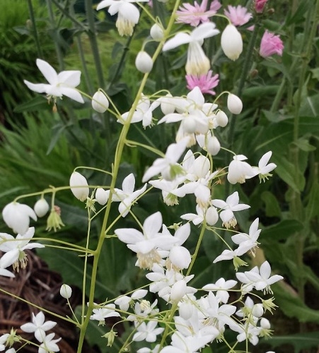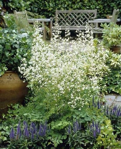 Многолетнее растение высотой до 120 сантиметров. Листья ажурные светло-зеленые, цветки белые, мелкие, собраны в метелку, с бледно-кремовыми тычками. Время цветения июль-август. Название латинское: Thalictrum delavayi 'Album' Особенности выращивания и ухода: Неприхотливы и отлично переносят климат умеренной зоны. Большинство видов хорошо растут как на солнце, так и при небольшом затенении. Нетребовательны эти растения и к почвам — прекрасно развиваются даже на малоплодородных участках, главное, чтобы было достаточно влаги. Использование: Каменистые сады,миксбордеры и групповые посадки, соцветия годятся для срезки