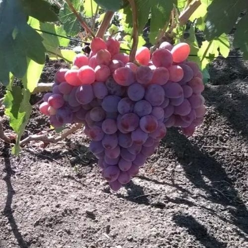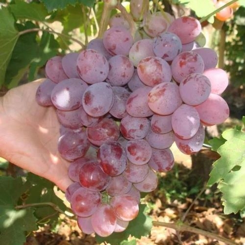 Виноград Атаман – это гибрид, который был получен путем скрещивания всем известных сортов Ризамат и Талисман Грозди очень крупные, так как ягоды достигают тоже не маленьких размеров, примерно 3 сантиметра в длину и столько же в ширину. Считается, что нормальная средняя масса одной грозди хорошо выспевшего винограда Атаман будет примерно 700 грамм. Созревающие ягоды имеют изумительную окраску – розовую с красным оттенком, часто цвет может меняться на фиолетовый. Мякоть – мясистая, очень сочная. Кожура плодов прочная, поэтому созревшие грозди хорошо переносят транспортировку. Несмотря на высокую урожайность, горошения у ягод не бывает. Вкусовые качества поспевших плодов замечательные – их сладость, сочетающаяся с легкой кислинкой, прекрасно освежает. Количество сахара в плодах среднее – около 18%, а кислоты в них – до 8 г/дм3. Кусты сильнорослые. Каждый лист состоит из пяти лопастей, листва большая, с нижней стороны слегка опушена. На кустах расцветают и мужские, и женские цветки. На зиму этот сорт следует обязательно укрывать, ведь морозоустойчивость у этого сорта невысокая: он выдерживает похолодание до –23, 25 градусов Цельсия.