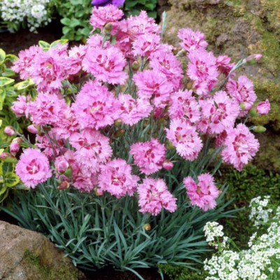 Образует подушку из серо-зелёных листьев высотой 10 см. Цветоносы высотой 25 см. Цветки одиночные, сильномахровые, розовые, с приятным довольно сильным ароматом, бутоны растрескиваются. Цветение: июнь-июль