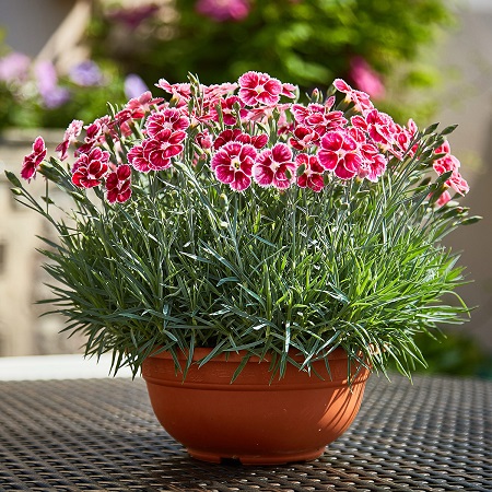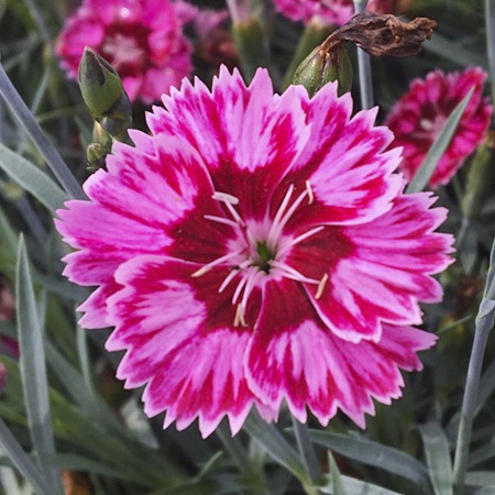 Неприхотливое многолетнее растение, высотой 25-30 cm. Листья узкие, серо-зеленые. Цветки пурпурно-розовые цветы со сладким ароматом, обрамленные белыми краями, диаметром 1,5-2 см. Цветение: июнь-июль