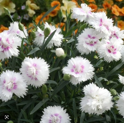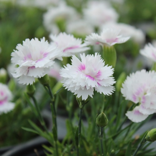 Многолетнее растение с вечнозелеными листьями и великолепными ароматными цветами в период роста высотой 25-30 cm. Листья узкие, серо-зеленые. Цветки белые с розовыми пятнами по середине, обрамленные белыми краями, диаметром 1,5-2 см. Цветение: июнь-июль