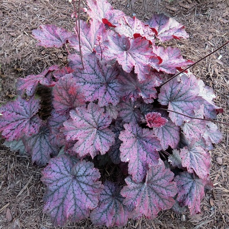 Высота 20 см, диаметр куста 40 см. Листья крупные, кленовидной формы, пурпурно-красного цвета с переходом в красно-фиолетовый с серебристой вуалью, жилки контрастные, темные. Цветет в мае-июне светло-розовыми колокольчатыми цветками.
