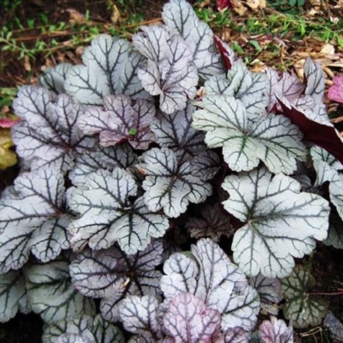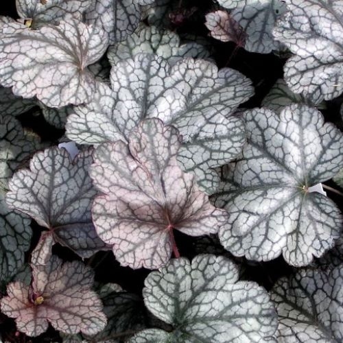 Высота листвы у взрослого растения 20-25 см., высота цветоносов 40-45 см. ширина растения 40-45 см. Листья мягкие сверху - пурпурно-серебристые с тёмно-пурпурными прожилками (кроме того, иногда может присутствовать зеленоватый оттенок), с нижней стороны - малиновые или пурпурно-малиновые, цветки мелкие, кремовые или розовато-кремовые располагаются на прямостоячих, достаточно тонких цветоносах. Период цветения с середины июня по июль. Название латинское: Heuchera Silver Scrolls Особенности выращивания и ухода: Требует хорошо дренированных почв, с большим содержанием гумуса. Поэтому для успешного выращивания гейхер возможно понадобится дополнительное внесение в почву перепревшего компоста или перегноя и крупнозернистого песка. Для полной окраски листвы необходимо довольно яркое освещения. Вполне зимостойкий сорт. Применение: Очень популярное в последнее время растение. Широко используется в миксбордерах, клумбах, бордюрах и т.д. Хорошо смотриться и как солитерное растение, и при посадке большими группами. Дополнительные комментарии: Для успешной зимовки ни в коем случае листья не обрезают на зиму!
