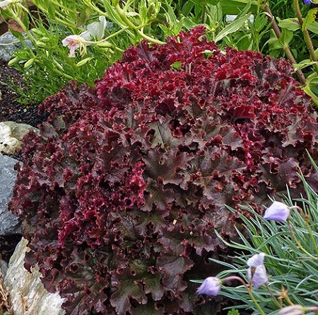 Невысокое многолетнее растение,высота 30-45 см, ширина 30-45 см. Листья длинночерешковые, собраны в прикорневую розетку. Листовая пластинка округлая, лопастная, с сильно волнистыми краями, окраска сверху от коричнево-зелёной до пурпурно-коричневой, снизу - пурпурно-красная. Цветки мелкие, белые, колокольчатой формы, собраны в рыхлые метельчатые соцветия на прямых цветоносах. Зацветает в июне. Название латинское: Heuchera 'Crimson Curls' Особенности выращивания и ухода: Гейхера гибридная хорошо растёт в пятнистой тени на плодородных, умеренно влажных, дренированных почвах. Применение: Каменистые сады. Бордюры. Цветники различного типа. Растение для контейнеров.