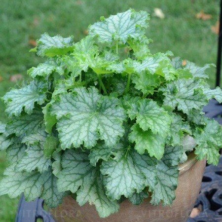 Среднего размера гейхера, листья крупные, плотные, рифленые, зелено-серебристые. Цветет непрерывно летом, цветеносы длинные, крепкие, цветки кремово-белые. Высота 20 см, диаметр куста 30 см.