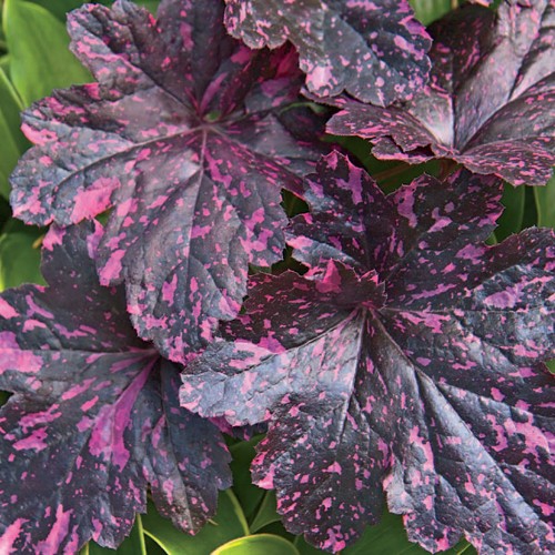 Блестящие шоколадные листья. Яркий розово-малиновый крап. Розовые блики появляются весной и, увеличиваясь, становятся все ярче и насыщенней. Кустик компактный, изысканно изящный. Лучшая гейхера Англии 2008 года. Солнце или полутень.