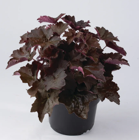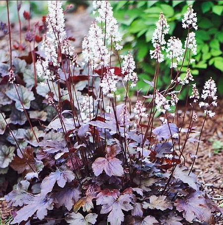 Один из самых старых сортов гейхеры, но, безусловно, и самый популярный.  Пурпурные, коричневатые, с металлическим отливом листья. На их фоне очень изящно выглядят светло-розовые, почти белые цветки на длинных цветоносах.