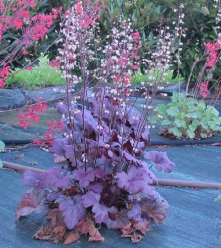 Высота растения 15-20 см., цветоноса 30 см., диаметр до 30-40 см. Листья небольшие, блестящий, сливово-фиолетовые в течение всего лета. К концу сезона цвет становится глянцевым черно-фиолетовым. Цветки белые на низких, темно-фиолетовых цветоножках. Период цветения: с июня по сентябрь. Сохраняет свой сливово-фиолетовый цвет листьев в течение всего лета. Особенности выращивания и ухода: Требует хорошо дренированных почв, с большим содержанием гумуса. Поэтому для успешного выращивания гейхер возможно понадобится дополнительное внесение в почву перепревшего компоста или перегноя и крупнозернистого песка. Для полной окраски листвы необходимо довольно яркое освещения. Вполне зимостойкий сорт. Применение: Очень популярное в последнее время растение. Широко используется в миксбордерах, клумбах, бордюрах и т.д. Хорошо смотриться и как солитерное растение, и при посадке большими группами. Дополнительные комментарии: Для успешной зимовки ни в коем случае листья не обрезают на зиму!