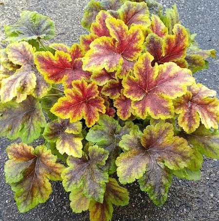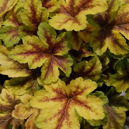 Яркие желтые рельефные перистые листья с рубиново-красным центром. Яркая и контрастная гейхерелла. Цветы неброские бело-розовые.