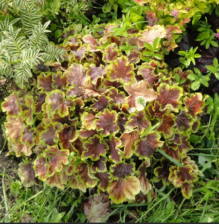 Крупные округлые слаборассеченные темно-красно-коричневые листья с лимонно-зеленой каймой. Цветки белые. Хорошо растет, не обгорает на солнце и сохраняет окраску весь сезон. Размер 30см на 40см. Период цветения: июнь-июль.