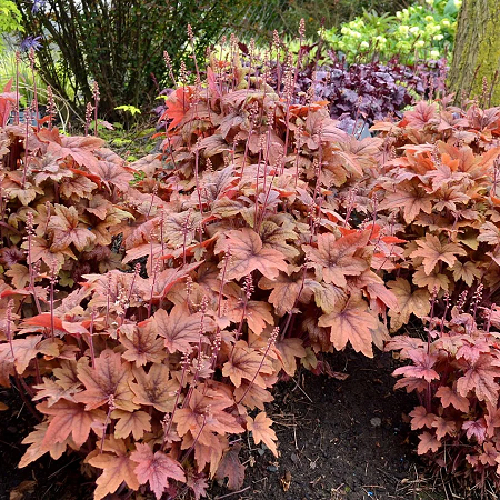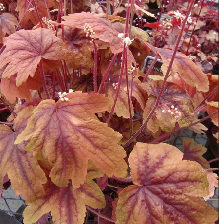 Гейхерелла 'Sweet Tea'- самая интенсивно окрашенная гейхерелла. Цвет спелого апельсина с коричнево-вишневым пятном. Летом – цвета чуть темнее, к осени - вспыхивают с особой яркостью. Особый шарм растению придают разрезанные пальчатые листья кленовидной формы. Белые цветы лишь подчеркивают статность растения.