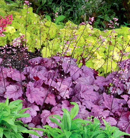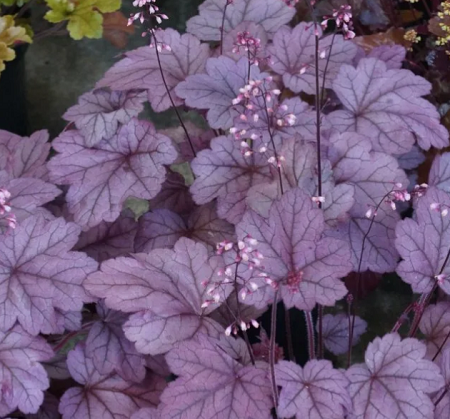 Удивительный цвет на протяжении всего сезона. Розово-фиолетовые бархатные листья с серебристо-розовым налетом и прожилками цвета сливы. Цветы розово-фиолетового цвета. Высота растения-20 см, диаметр-35 см. Гейхера с быстрым темпом роста. цветет май-июнь.