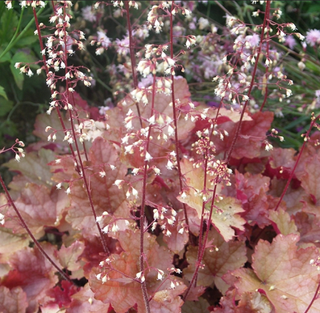 Высота растения 15 см, с соцветиями до 30 см, ширина куста 40 см. Прекрасная нежная окраска листьев - розово-оранжеватые, с нижней стороны тёмно-розовые. Цветки белые. Цветение в июне. Название латинское: Heuchera Penelope Особенности выращивания и ухода: Неприхотлива к почвам и климату, устойчива к морозам и болезням, главное – не допускать застоя воды в почве. Месторасположение - солнце, полутень. Зона зимостойкости: 4 (-35 ° С). Использование: Очень популярное в последнее время растение. Широко используется в миксбордерах, клумбах, бордюрах и т.д. Хорошо смотриться и как солитерное растение, и при посадке большими группами.
