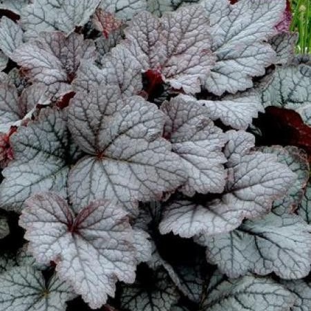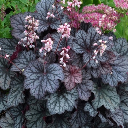 Листья бархатистые, угольно-пепельного цвета с серебристым налётом и тёмным рисунком прожилок. Цвет листвы дополняет пышное цветение. Белые соцветия выгодно подчёркивают тёмные листья. Описание Гейхерелла Твайлайт.  В ширину куст может занимать до 60 см. Высота: 20-25 см. Время цветения: июнь -август.