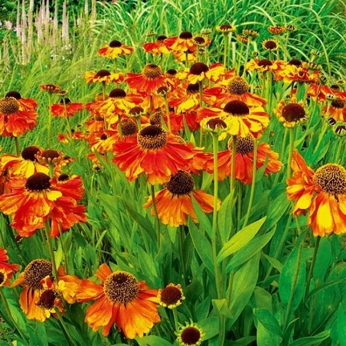Высота 90-120 см, цветки - 6-7 см, очень крупные. Бархатистый шоколадный центр в 1-2 ряда обрамляют двухцветные алло-желтые, которые по мере отцветания становятся более светлыми желто-оранжевыми. Цветет очень долго, с июля и до заморозков. Название латинское: Helenium autumnale 'Sahin's Early Flowerer' Особенности выращивания и ухода:предпочитают плодородные, хорошо обработанные и обеспеченные влагой нейтральные почвы. В сухую и жаркую погоду нуждаются в обильном поливе. Хорошо отзываются на органические и минеральные подкормки (2-3 раза за лето). Растения зимостойкие, но если их не делить дольше 3-4 лет, то розетки могут подмерзать. Использование: Высаживают на заднем плане больших цветников, около декоративных кустарников, группами или одиночно, около оград, построек, которые желательно задекорировать растениями. Великолепно сочетается гелениум с другими многолетниками цветущими осенью, например, астрами. Хороши цветы в осенних букетах, только срезать их нужно полностью распустившимися, так как в воде соцветия не раскрываются.