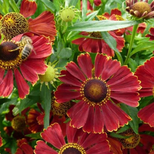 Многолетнее растение высотой 60-80 см. Побеги прямые, крепкие, листья темно-зеленые, ланцетные, мелкопильчатые. Конус тёмно-коричневый, цветки крупные, бордово-красные, с желтой каймой на лепестках и коричневым центром. Период цветения - с июля по сентябрь.