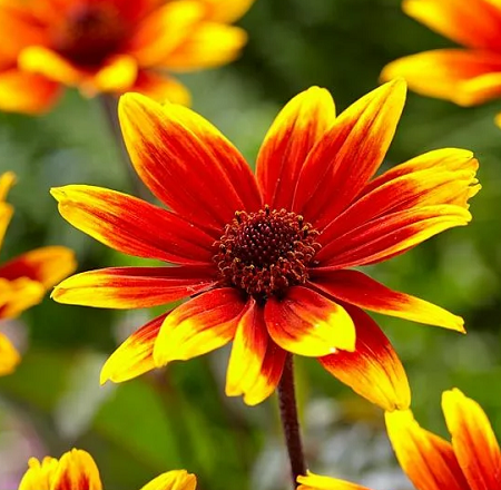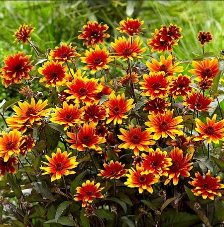 Цветки махровые, яркие, оранжево-красные в центре и жёлтые по краям. Цветение обильное и продолжительное, в июне-сентябре. Цветы отлично подходят для срезки. Листья плотные, тёмные, коричнево-зелёные. Высота 60-80 см. Растение засухоустойчивое. Место солнечное. Почва дренированная.