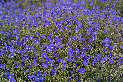 Многолетник высотой 60-80 см, диаметр кроны до 90 см. Цветение: апрель - сентябрь. Цветки большие, тёмно-синие с белым центром, цветение длительное. Листья глубоко-лопастные.