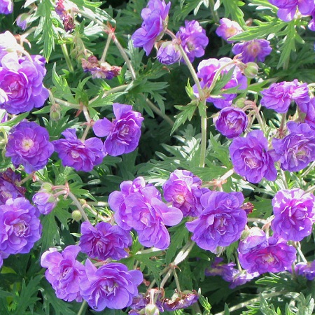 Герань гималайская махровая - корневищный многолетник с прямыми немногочисленными побегами. Листья на длинных черешках, округлые, пятираздельные, покрытые волосками. Цветки крупные, махровые, лилово-синие с пурпурно-розовым оттенком в центре. Высота растения 30 см, период цветения июнь-сентябрь.