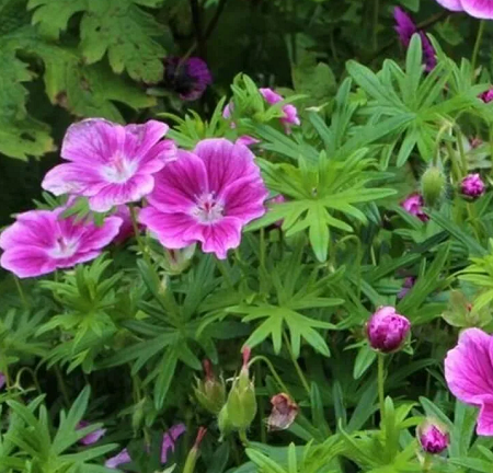 Kистья зимующие, глубоко-рассеченные, светло-зеленые, а осенью часть листьев приобретает ярко-красную окраску. Высота достигает 60 см. Стебли практически не превышают листья, и многочисленные карминно-красные цветки до 4 см в диаметре усыпают весь куст. Цветет долго и обильно, с середины июня до августа. Элке: глянцевая зеленая листва создает прекрасный фон для цветов. Цветки темно-розовые с красными прожилками на лепестках и белыми краями вокруг них.