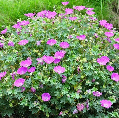 Невысокий и очень привлекательный сорт герани. Высота растения не превышает 20 см. Куст стабильно декоративный, правильной сферической формы. Листья ажурные. Цветки розовые, с более темными прожилками. После первых заморозков, листья преобретают ярко-красную окраску. Время цветения: середина июня-август. Название латинское: Geranium sanguineum Max Frei