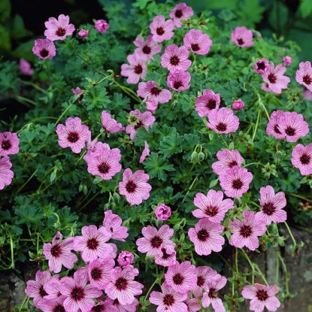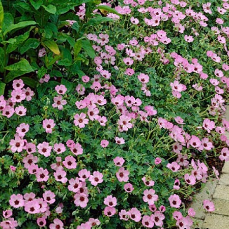 Очень нежный сорт низкорослой герани. Высота не более 10-15 см. Листья округлые, лопастные. Цветки серебристо-розовые. Обильно цветет в июле-августе. Название латинское: Geranium cinereum Ballerina
