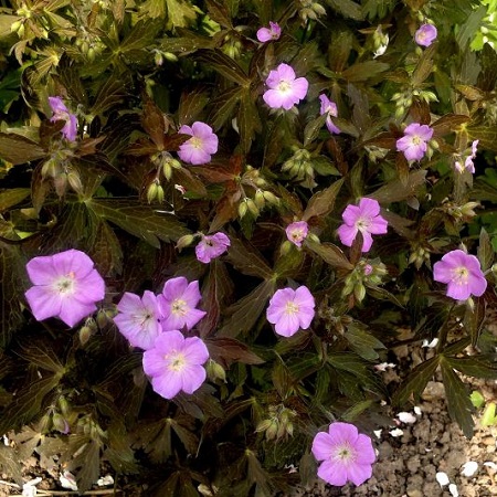Высота взрослого растения 40 см. Интересный и необычный сорт герани! Окраска листвы насыщенно шоколадная осенью становится золотистой. Цветки розовые с белым центром, с июня по июль, а осенью часто зацветает повторно. Желательно срезать отцветшие цветоносы.