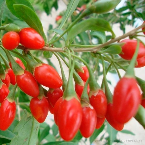 Высота куста от 2 до 2,5 метров, ветви гибкие, с шипами. Ягоды красного цвета, длиной 1,5-2 см и шириной около 1 см, имеют приятный сладкий вкус с еле ощутимой горчинкой. Ягоды созревают в августе-сентябре. Растение начинает плодоносить со 2-3 года после посадки. Лучше размещать саженцы на хорошо освещенный участок, так как в тени будет хуже плодоносить. Годжи хорошо относится к подкормкам. В середине лета рекомендуется удобрить комплексным минеральным удобрением.