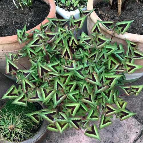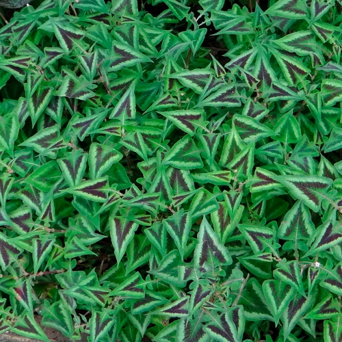 Ранней весной оно выпускает побеги тёмно-красного цвета, на которых разворачиваются заострённые сердцевидные листья сливово-красного оттенка с металлическим блеском. Летом бархатистые листья на красных стеблях становятся более зелёными, но сохраняют акцентируемый красным краем лист с трёхцветной раскраской: серебристой, зелёной и тёмно-коричневой. В регионах с жаркими ночами окраска листьев не будет столь яркой. А в холодных областях наиболее интенсивный цвет проявляется в конце лета.